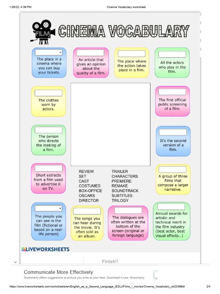 Getting no-cost English worksheets: cinema vocabulary can be straightforward and convenient, you can use the internet browser and check out websites that focus in providing free resources. Be choosy about the online platforms you check out, pick well-known sites that supply high-quality, accurate downloads.